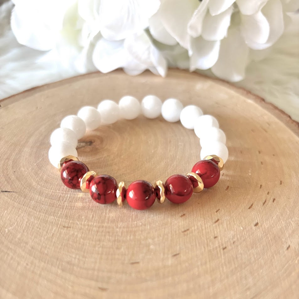 Red howlite contributes grounding through steadiness. Known for its association with emotional regulation and patience, it supports calm response and centered awareness, particularly during moments of stress or transition.