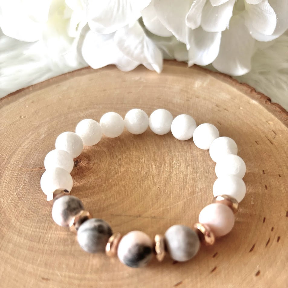 Pink zebra jasper adds a stabilizing yet nurturing influence. Known for its grounding qualities, it supports emotional balance and a calm connection to one’s inner rhythm.